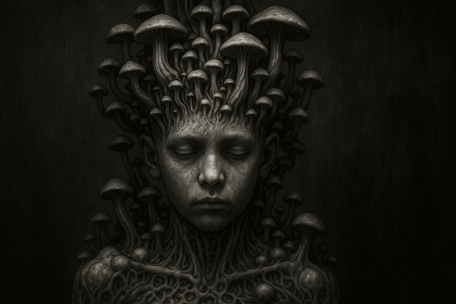 Das Bild „Symbiose des Verfalls“ zeigt den Kopf und die Schultern eines Jungen, dessen Körper scheinbar nicht mehr rein menschlich ist. Aus seiner Kopfhaut sprießen unzählige Pilze, die in einem dichten, fast organisch gewachsenen Geflecht seinen gesamten Schädel überwuchern. Auch seine Schultern und der obere Brustbereich sind durchzogen von pilzartigen Strukturen – mal zart, mal wulstig, mal mit schuppiger Textur. Die Haut des Jungen wirkt steinern oder wie von einer äußeren, biologisch anmutenden Schicht überzogen. Seine Augen sind geschlossen, die Gesichtszüge friedlich, fast meditativ – als würde er sich seinem Zustand ergeben oder sich in einem Zustand tiefer, innerer Ruhe befinden.