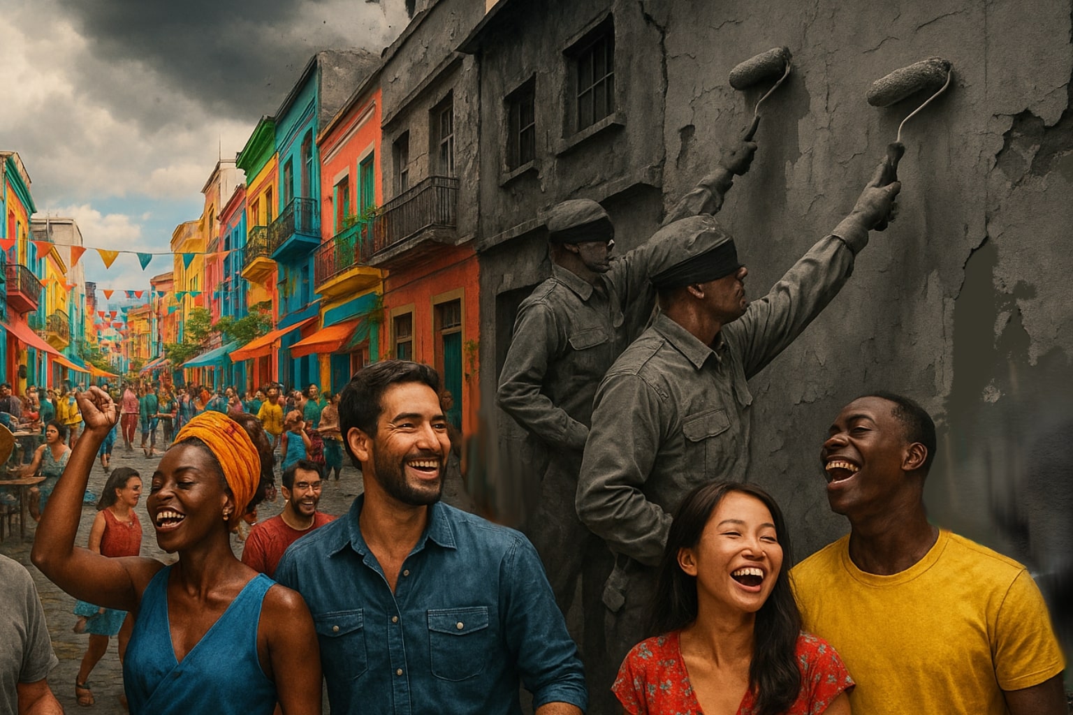 In diesem KI Bild lässt sich dieses Spannungsverhältnis auf einer metaphorischen Ebene lesen. Die Menschen feiern das Leben, die Farbe steht für Freiheit, Offenheit, Begegnung. Die grauen Sicherheitsleute mit verbundenen Augen sind diejenigen, die nicht sehen wollen, aber handeln. Sie übermalen die Lebendigkeit mit Grau, während der graue Teil schon bröckelt. Ein Vorbote des Untergangs, wenn Vielfalt unterdrückt wird. Anderssein rechtspopulistisch verzerrt als Problem dargestellt. Und wo das reaktionäre Grau kommt, beginnt die Stadt zu zerfallen. Nicht weil Vielfalt scheitert, sondern weil die Vielfalt ausgegrenzt wird.