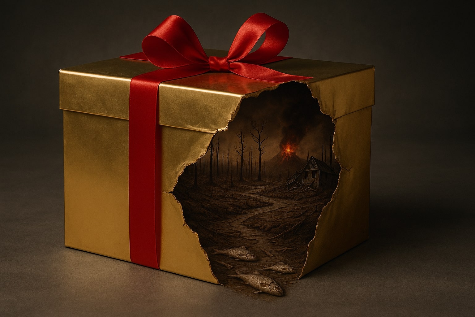 In dieser Spannung zwischen Verführung und Offenlegung liegt die eigentliche Brutalität des Bildes. Es zeigt, dass das „Geschenk“ unserer Gegenwart für kommende Generationen möglicherweise genau das ist: ein schöner Karton, der beim Öffnen nichts als verbrannte Zukunft bereithält.