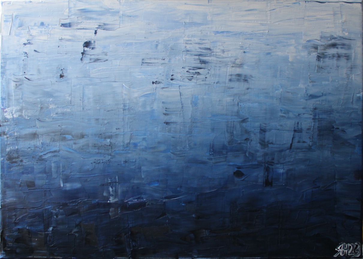 Auftragsarbeit für eine sehr gute Freundin. Das Bild vermittelt eine Reise in die Tiefe. Oben wirkt das helle Weiß wie Licht, das durch die Wasseroberfläche bricht. Mit dem Verlauf ins Dunkelblau verstärkt sich der Eindruck von Tiefe und Abgeschiedenheit. Das Auge wird nach unten gezogen, wo die Farben dichter und schwerer werden. Das Bild ruft Stille, Weite und auch Ungewissheit hervor. Es kann als Sinnbild für das Eintauchen ins Unbewusste gelesen werden, wo Klarheit und Dunkelheit aufeinandertreffen. So verbindet das Werk Ruhe mit einer latenten Spannung zwischen Sicherheit an der Oberfläche und Geheimnis in der Tiefe.
