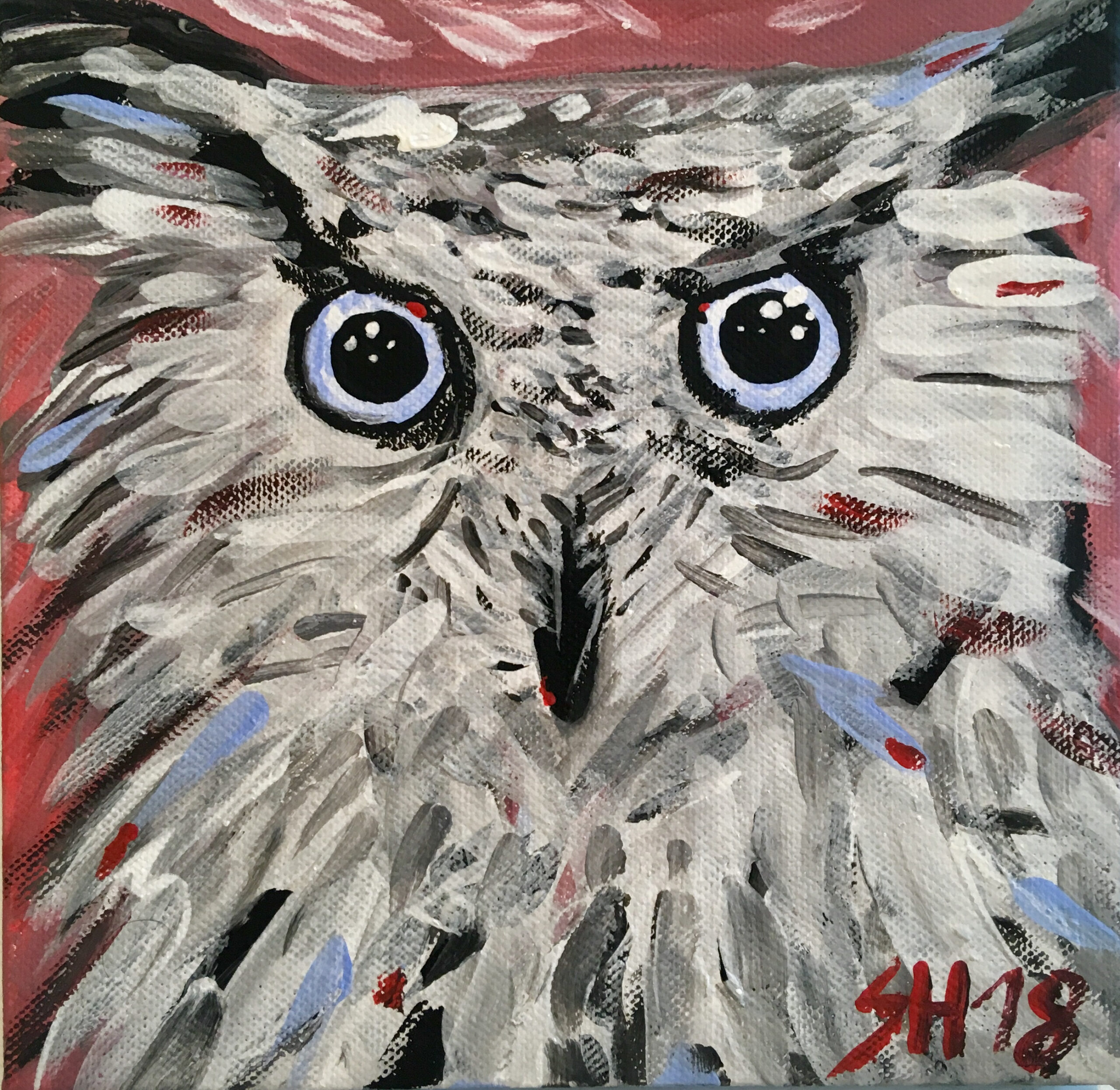 Eins von meinen selbst gemalten Bildern: eine gemalte Eule. Kurz gesagt: ein Eulenkind mit intensivem Blick. Dabei expressionistisch gemalt in rot, weiß und blau (Acryl, 2018)